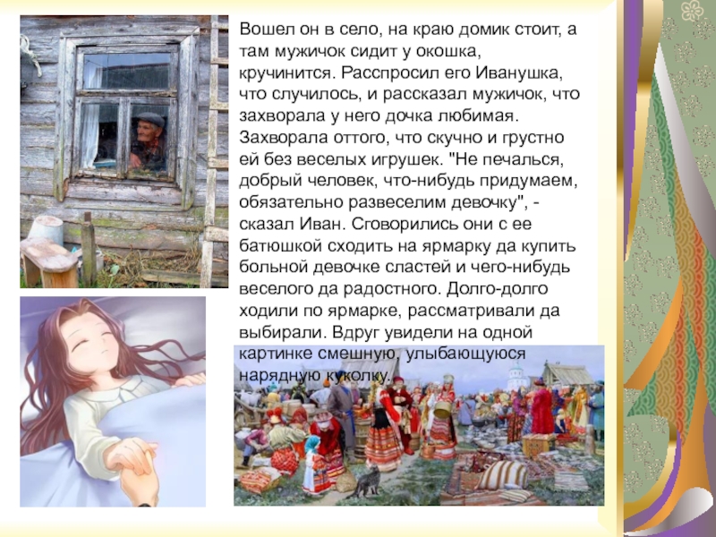 сидит у окошка, кручинится. Расспросил его Иванушка, что случилось, и рассказал мужичок, что захворала у него дочка любимая. Захворала оттого, что скучно и грустно ей без веселых игрушек. "Не печалься, добрый человек, что-нибудь придумаем, обязательно развеселим девочку", - сказал Иван. Сговорились они с ее батюшкой сходить на ярмарку да купить больной девочке сластей и чего-нибудь веселого да радостного. Долго-долго ходили по ярмарке, рассматривали да выбирали. Вдруг увидели на одной картинке смешную, улыбающуюся нарядную куколку.