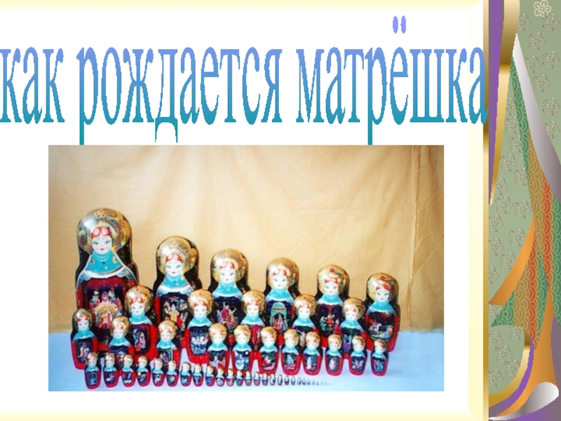 -Вот так ребята родилась матрёшка. Матрешка, старинная традиционная, народная игрушка. Её не случайно называют народной, потому что она сделана добрыми руками русских людей.