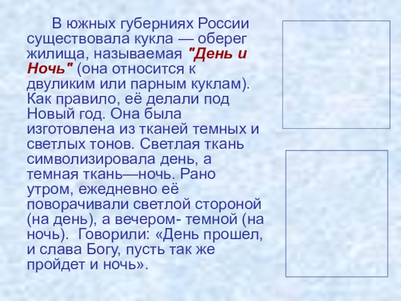 и Ночь" (она относится к двуликим или парным куклам). Как правило, её делали под Новый год. Она была изготовлена из тканей темных и светлых тонов. Светлая ткань символизировала день, а темная ткань—ночь. Рано утром, ежедневно её поворачивали светлой стороной (на день), а вечером- темной (на ночь). Говорили: «День прошел, и слава Богу, пусть так же пройдет и ночь».