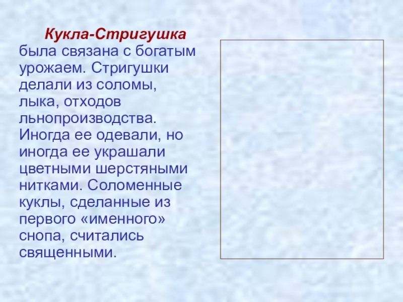 Слайд 14 Кукла-Стригушка была связана с богатым урожаем. Стригушки делали из соломы, лыка,
