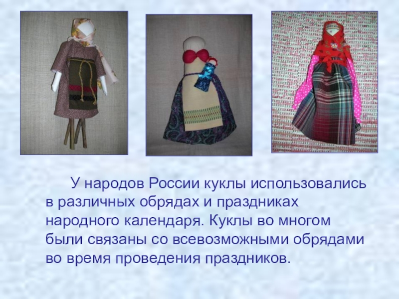 У народов России куклы использовались в различных обрядах и праздниках народного календаря. Куклы во многом были связаны