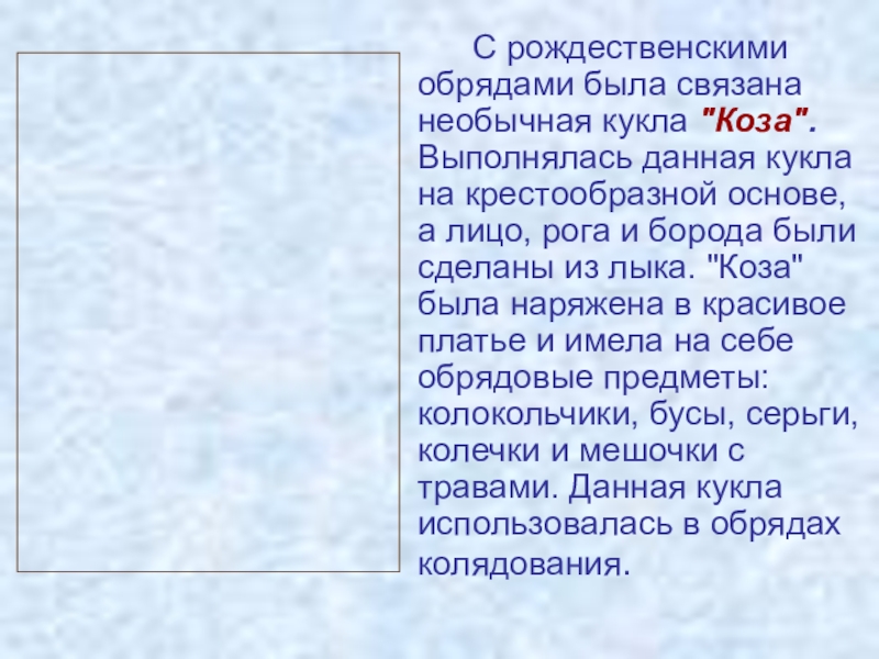 Слайд 15 С рождественскими обрядами была связана необычная кукла "Коза". Выполнялась данная кукла