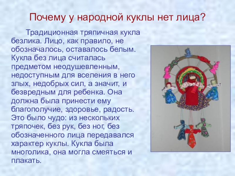 Почему у народной куклы нет лица? Традиционная тряпичная кукла безлика. Лицо, как правило, не обозначалось, оставалось белым. Кукла без лица считалась предметом неодушевленным, недоступным для вселения в него злых, недобрых сил, а значит, и безвредным для ребенка.