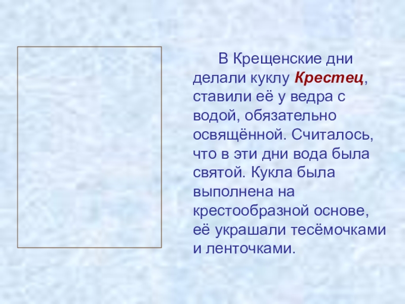 Слайд 16 В Крещенские дни делали куклу Крестец, ставили её у ведра с