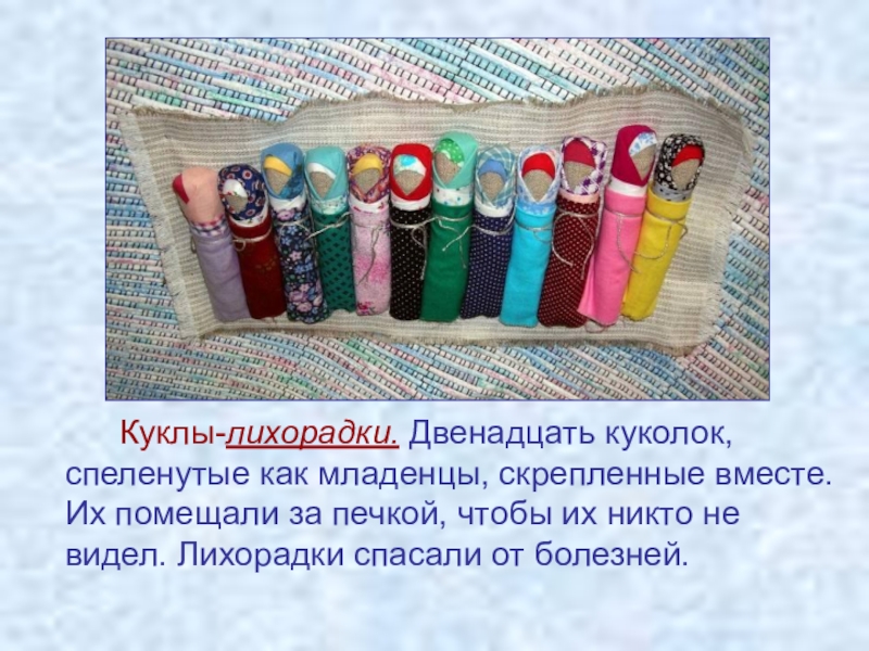 Слайд 11 Куклы-лихорадки. Двенадцать куколок, спеленутые как младенцы, скрепленные вместе. Их помещали за