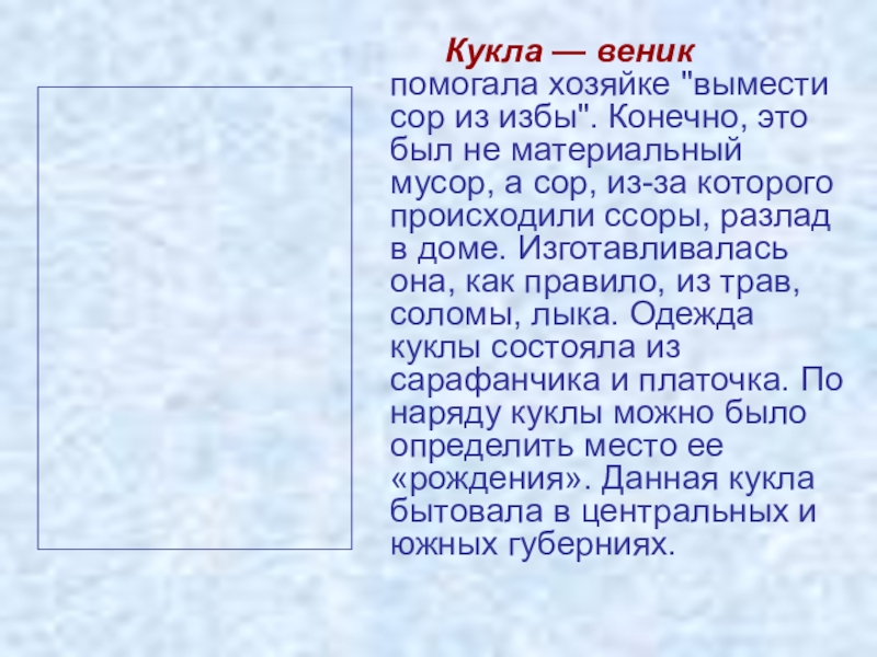 Слайд 10 Кукла — веник помогала хозяйке "вымести сор из избы". Конечно, это