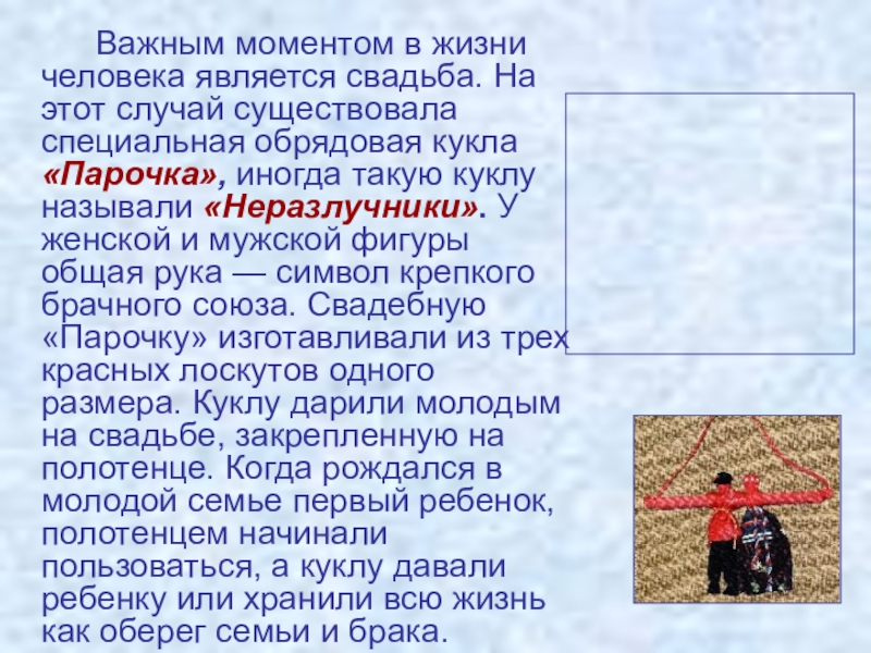 Важным моментом в жизни человека является свадьба. На этот случай существовала специальная обрядовая кукла «Парочка», иногда такую