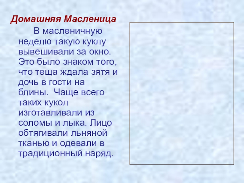 В масленичную неделю такую куклу вывешивали за окно. Это было