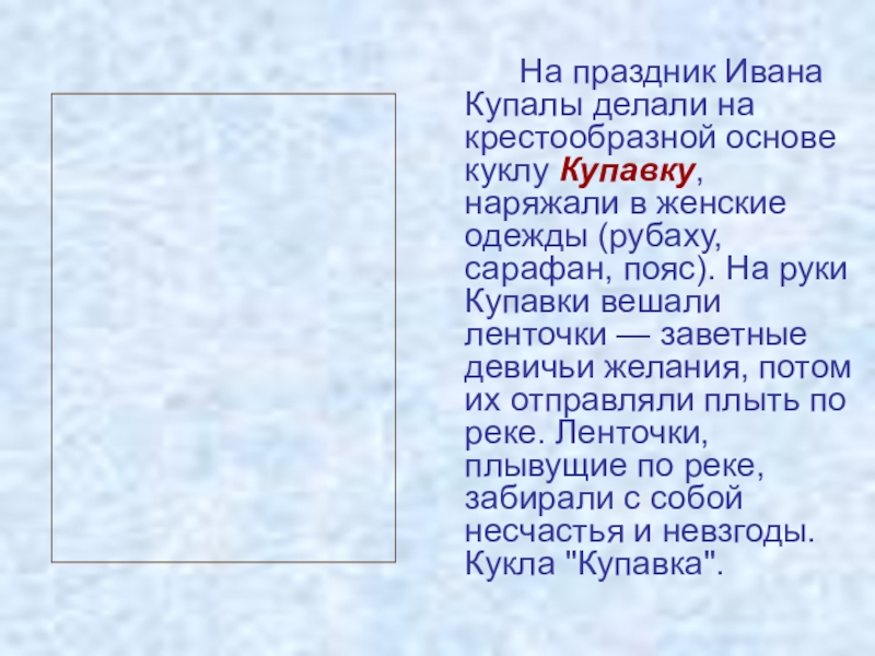 Слайд 19 На праздник Ивана Купалы делали на крестообразной основе куклу Купавку, наряжали