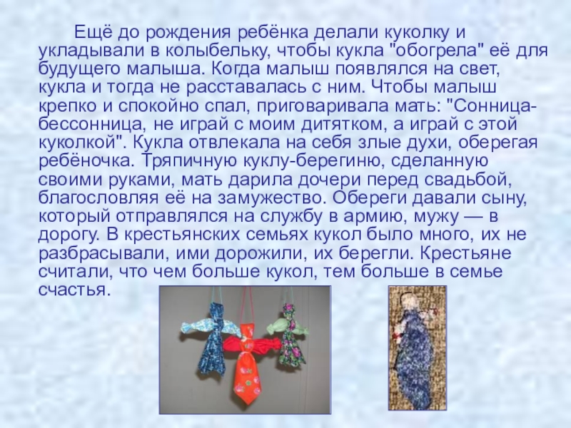 кукла "обогрела" её для будущего малыша. Когда малыш появлялся на свет, кукла и тогда не расставалась с ним. Чтобы малыш крепко и спокойно спал, приговаривала мать: "Сонница- бессонница, не играй с моим дитятком, а играй с этой куколкой". Кукла отвлекала на себя злые духи, оберегая ребёночка. Тряпичную куклу-берегиню, сделанную своими руками, мать дарила дочери перед свадьбой, благословляя её на замужество. Обереги давали сыну, который отправлялся на службу в армию, мужу — в дорогу. В крестьянских семьях кукол было много, их не разбрасывали, ими дорожили, их берегли. Крестьяне считали, что чем больше кукол, тем больше в семье счастья.