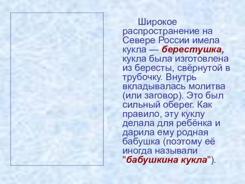 Слайд 6 Широкое распространение на Севере России имела кукла — берестушка, кукла была