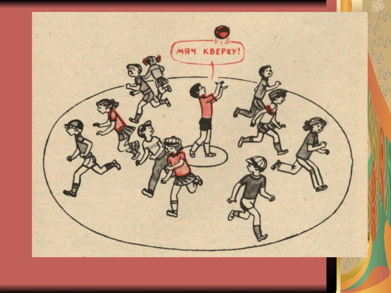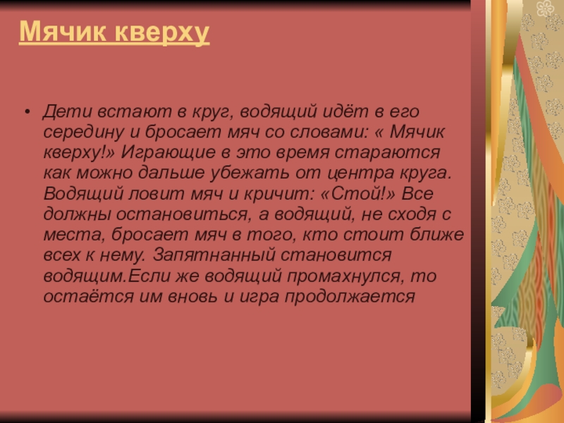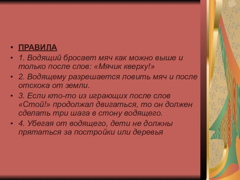 ПРАВИЛА1. Водящий бросает мяч как можно выше и только после слов: «Мячик кверху!»2. Водящему разрешается ловить мяч