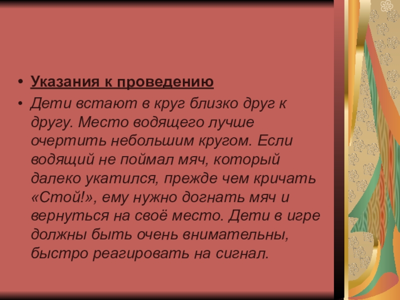 водящего лучше очертить небольшим кругом. Если водящий не поймал мяч, который далеко укатился, прежде чем кричать «Стой!», ему нужно догнать мяч и вернуться на своё место. Дети в игре должны быть очень внимательны, быстро реагировать на сигнал.