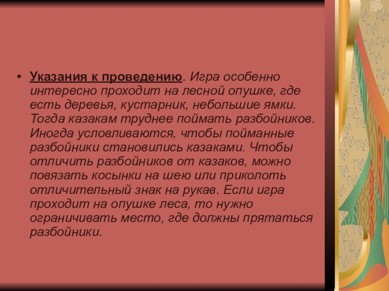 есть деревья, кустарник, небольшие ямки. Тогда казакам труднее поймать разбойников. Иногда условливаются, чтобы пойманные разбойники становились казаками. Чтобы отличить разбойников от казаков, можно повязать косынки на шею или приколоть отличительный знак на рукав. Если игра проходит на опушке леса, то нужно ограничивать место, где должны прятаться разбойники.