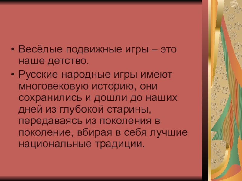 Весёлые подвижные игры – это наше детство. Русские народные игры имеют многовековую историю, они сохранились и дошли до наших дней из глубокой старины, передаваясь из поколения в поколение, вбирая в себя лучшие национальные традиции.