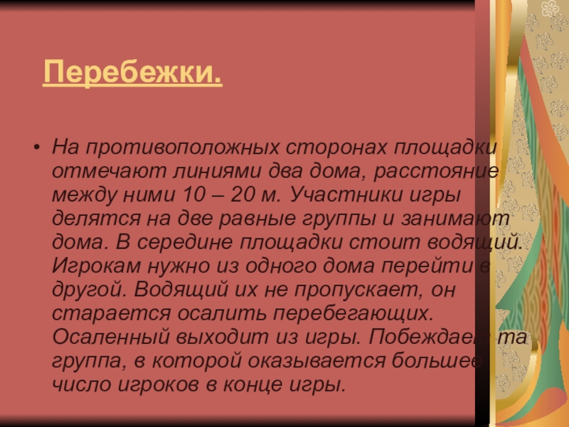 Перебежки.На противоположных сторонах площадки отмечают линиями два дома, расстояние между ними 10 – 20 м. Участники