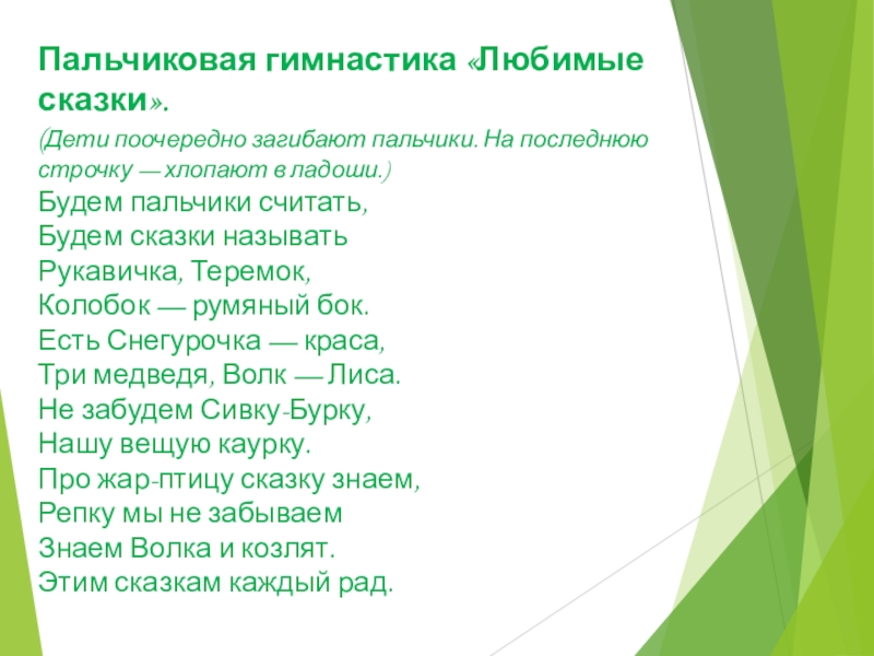 Слайд 5Пальчиковая гимнастика «Любимые сказки».