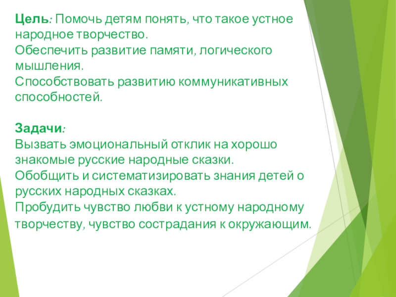 Слайд 2Цель: Помочь детям понять, что такое устное народное творчество.