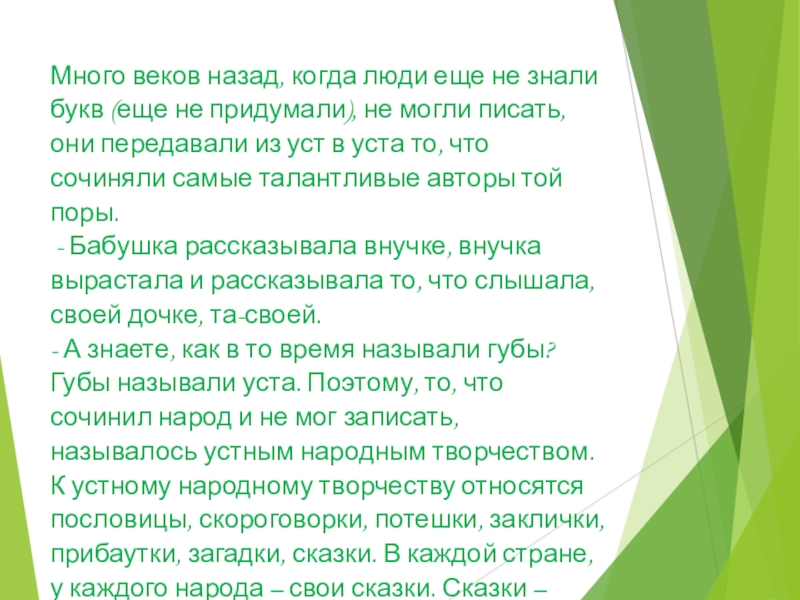 - А знаете, как в то время называли губы? Губы называли уста. Поэтому, то, что сочинил народ и не мог записать, называлось устным народным творчеством. К устному народному творчеству относятся пословицы, скороговорки, потешки, заклички, прибаутки, загадки, сказки. В каждой стране, у каждого народа – свои сказки. Сказки – один из видов устного народного творчества.