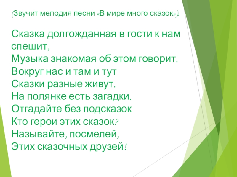 Слайд 6(Звучит мелодия песни «В мире много сказок»).