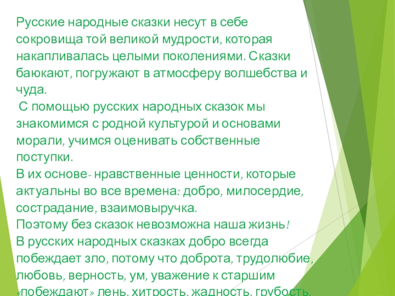 В русских народных сказках добро всегда побеждает зло, потому что доброта, трудолюбие, любовь, верность, ум, уважение к старшим «побеждают» лень, хитрость, жадность, грубость, трусость.