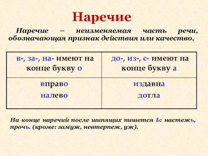 Наречие – неизменяемая часть речи, обозначающая признак действия или качество.