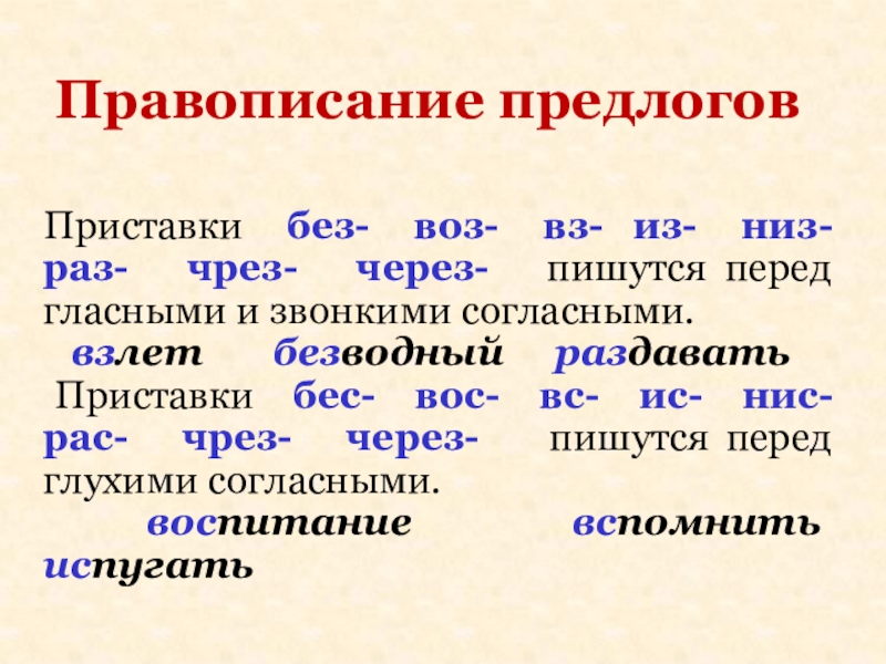 Приставки бес- вос- вс- ис- нис- рас- чрез- через- пишутся перед глухими согласными.