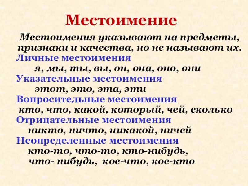Местоимения указывают на предметы, признаки и качества, но не называют их.