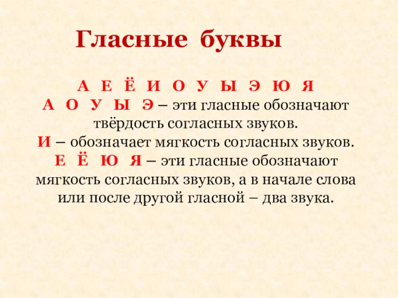 Е Ё Ю Я – эти гласные обозначают мягкость согласных звуков, а в начале слова или после другой гласной – два звука.