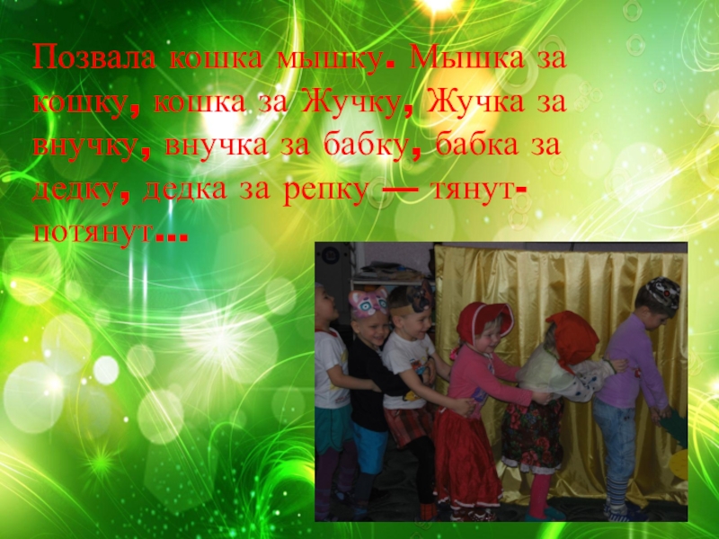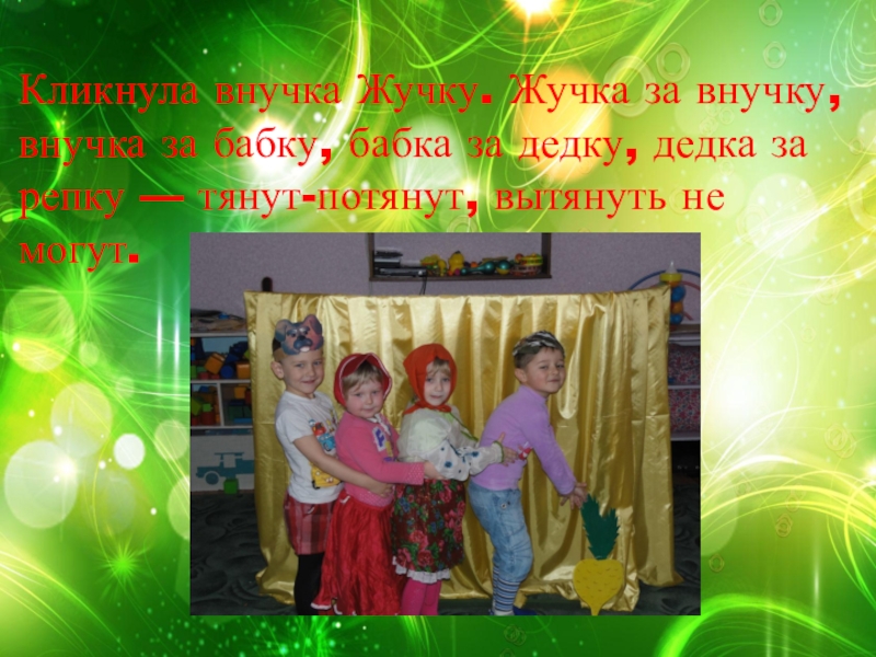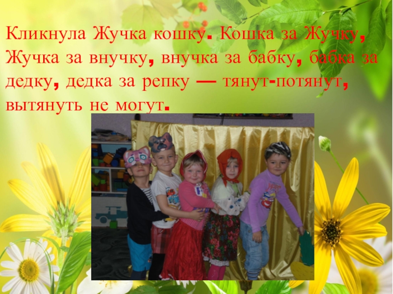 Слайд 6 Позвала бабка внучку. Внучка за бабку, бабка за дедку, дедка за