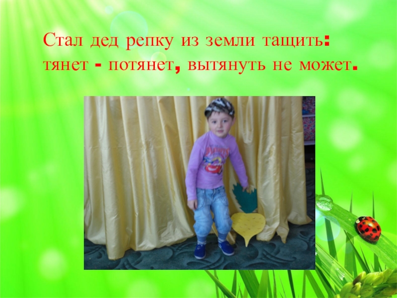 Слайд 5 Позвал дед бабку. Бабка за дедку, дедка за репку — тянут-потянут,