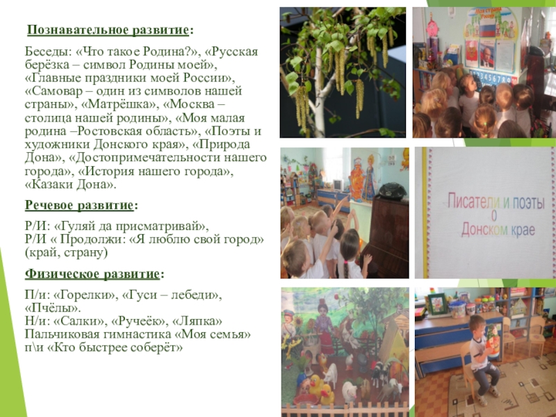 «Главные праздники моей России», «Самовар – один из символов нашей страны», «Матрёшка», «Москва – столица нашей родины», «Моя малая родина –Ростовская область», «Поэты и художники Донского края», «Природа Дона», «Достопримечательности нашего города», «История нашего города», «Казаки Дона».