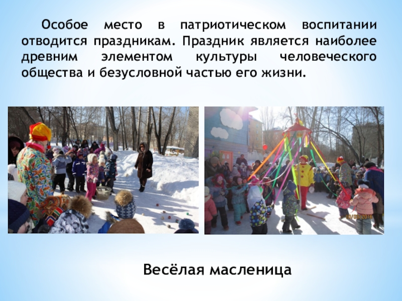 Слайд 28 Особое место в патриотическом воспитании отводится праздникам. Праздник является наиболее древним