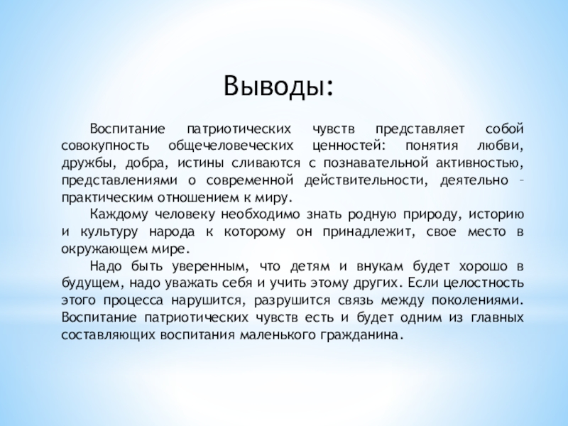 Воспитание патриотических чувств представляет собой совокупность общечеловеческих ценностей: понятия любви, дружбы, добра, истины сливаются с познавательной активностью, представлениями о современной действительности, деятельно – практическим отношением к миру.