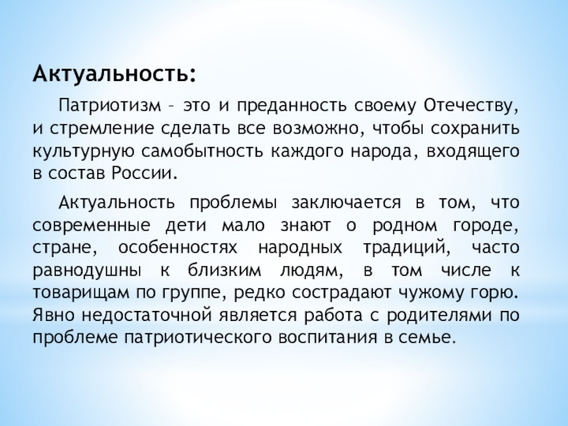 Актуальность проблемы заключается в том, что современные дети мало знают о родном городе, стране, особенностях народных традиций, часто равнодушны к близким людям, в том числе к товарищам по группе, редко сострадают чужому горю. Явно недостаточной является работа с родителями по проблеме патриотического воспитания в семье.