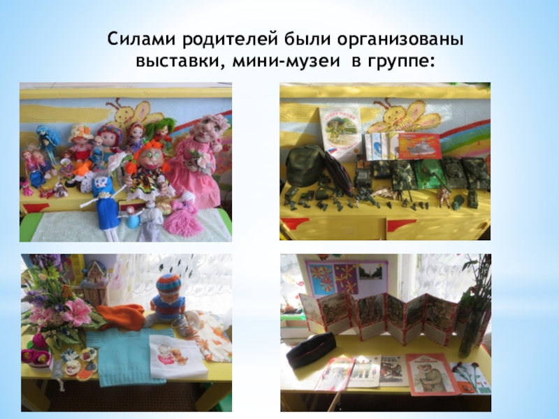 Слайд 36Силами родителей были организованы выставки, мини-музеи в группе: