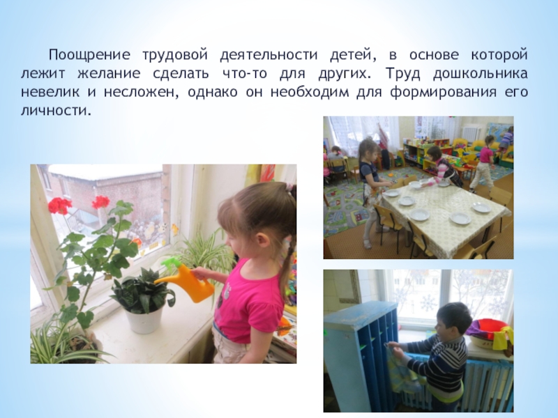 Слайд 31 Поощрение трудовой деятельности детей, в основе которой лежит желание сделать что-то