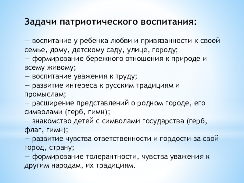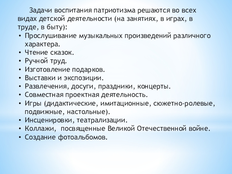 Слайд 6 Задачи воспитания патриотизма решаются во всех видах детской деятельности (на занятиях,