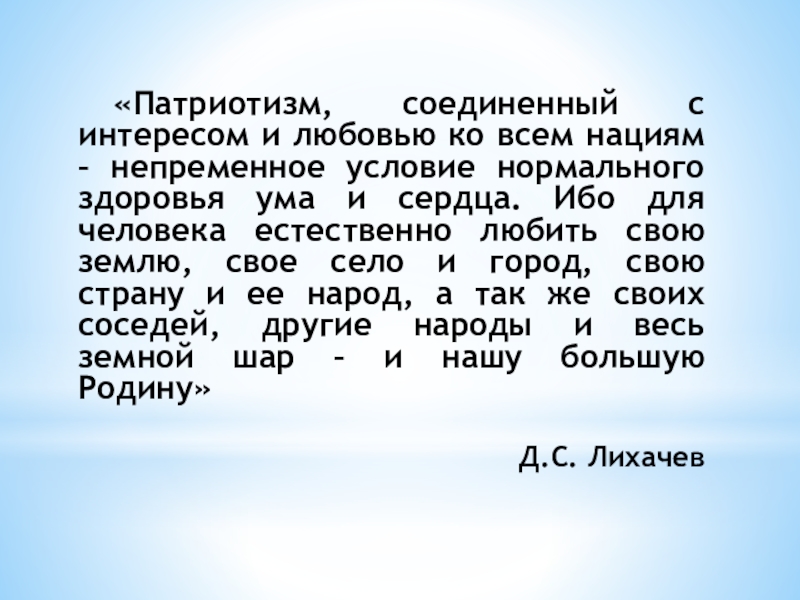 непременное условие нормального здоровья ума и сердца. Ибо для человека естественно любить свою землю, свое село и город, свою страну и ее народ, а так же своих соседей, другие народы и весь земной шар – и нашу большую Родину»