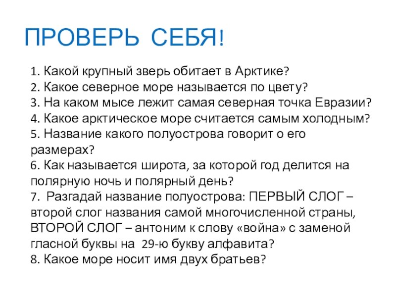 ПРОВЕРЬ СЕБЯ!1. Какой крупный зверь обитает в Арктике?2. Какое северное море называется по цвету?3. На каком мысе