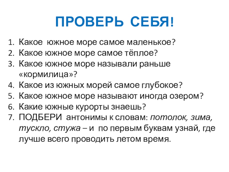 ПРОВЕРЬ СЕБЯ!Какое южное море самое маленькое?Какое южное море самое тёплое?Какое южное море называли раньше  «кормилица»?Какое из