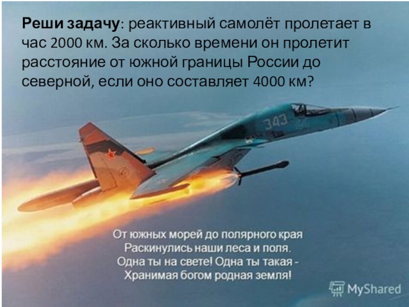 Слайд 30Реши задачу: реактивный самолёт пролетает в час 2000 км. За сколько