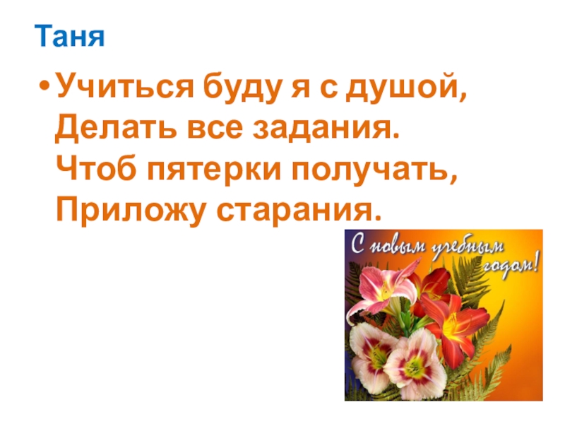 ТаняУчиться буду я с душой,  Делать все задания.  Чтоб пятерки получать, Приложу старания.