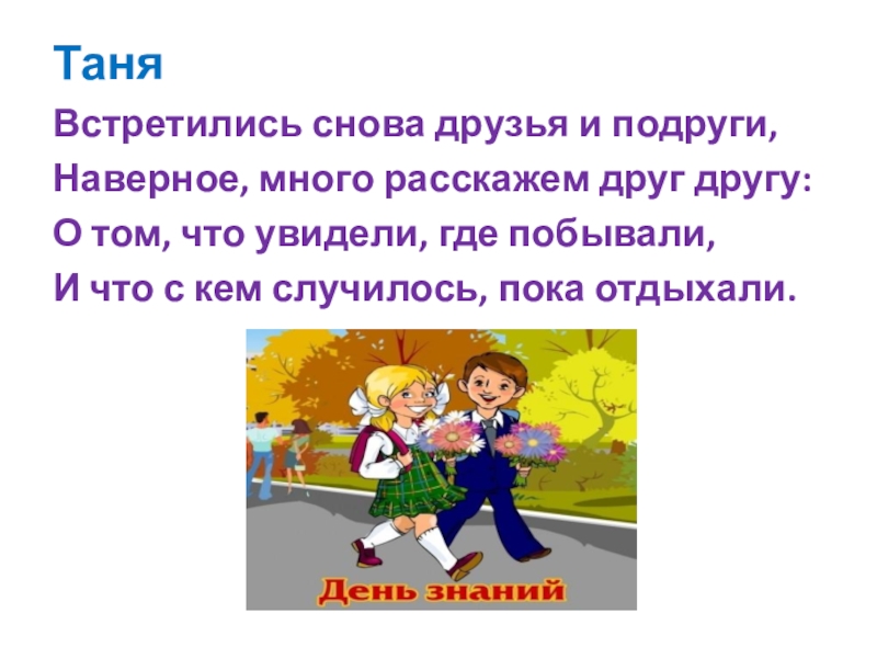 ТаняВстретились снова друзья и подруги, Наверное, много расскажем друг другу: О том, что увидели, где побывали, И что с кем