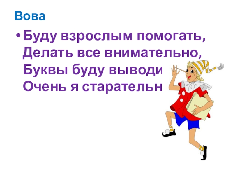 ВоваБуду взрослым помогать,  Делать все внимательно,  Буквы буду выводить  Очень я старательно.