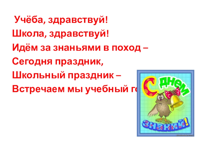 Учёба, здравствуй!Школа, здравствуй!Идём за знаньями в поход –Сегодня праздник,Школьный праздник – Встречаем мы учебный год!