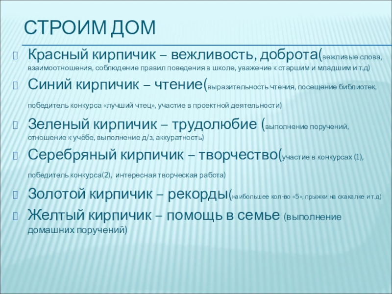 Зеленый кирпичик – трудолюбие (выполнение поручений, отношение к учёбе, выполнение д/з, аккуратность)