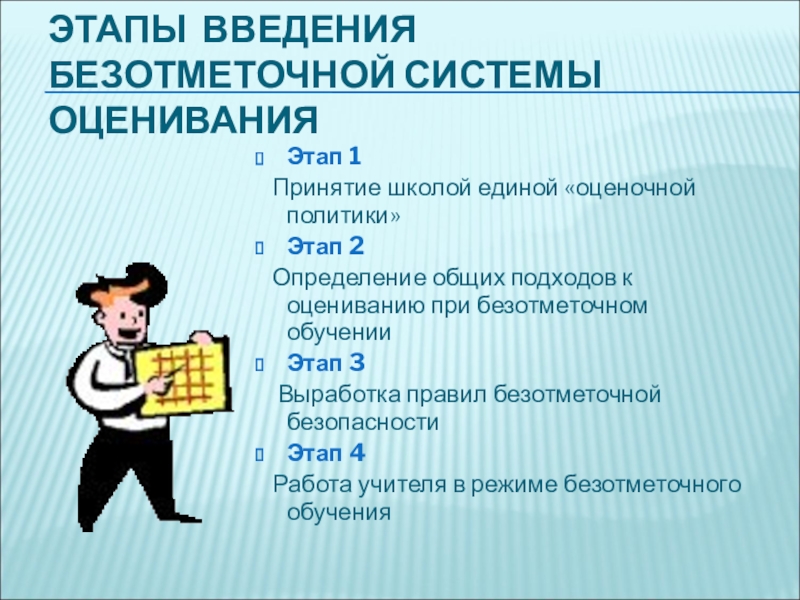 Слайд 9ЭТАПЫ ВВЕДЕНИЯ БЕЗОТМЕТОЧНОЙ СИСТЕМЫ ОЦЕНИВАНИЯ