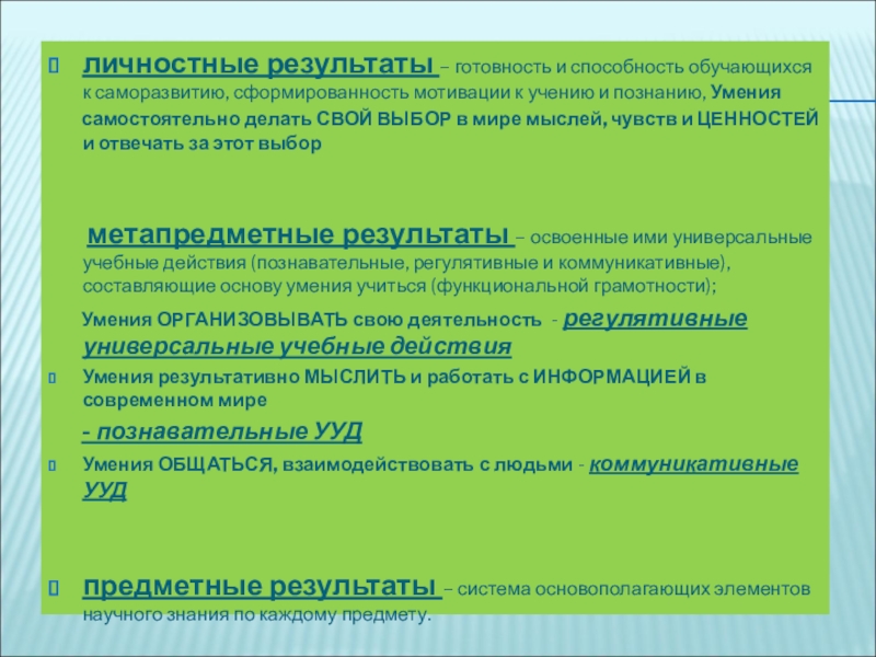 Слайд 3личностные результаты – готовность и способность обучающихся к саморазвитию, сформированность мотивации