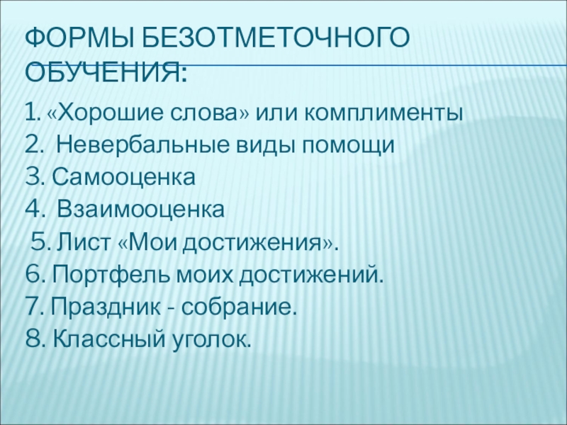 Слайд 13ФОРМЫ БЕЗОТМЕТОЧНОГО ОБУЧЕНИЯ: